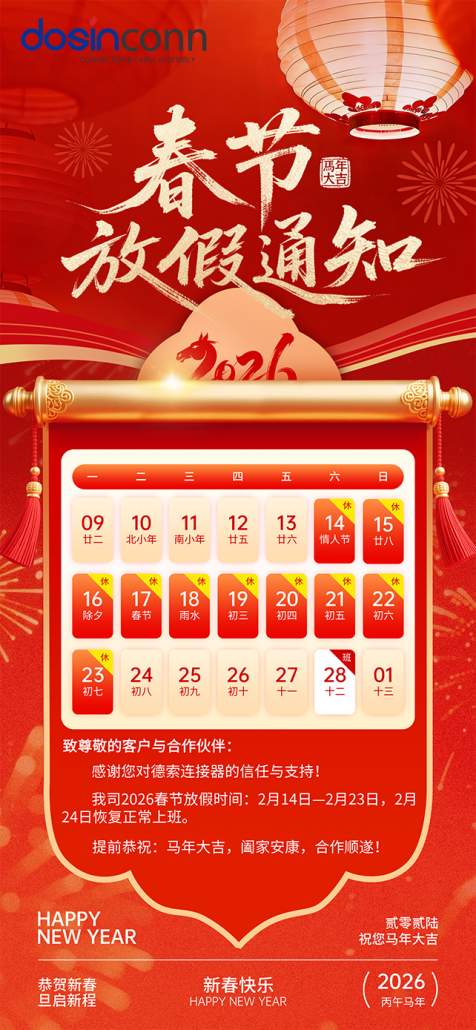 律回春渐,马跃新程。值此2026年新春佳节来临之际,德索连接器向长期以来支持我们的合作伙伴、辛勤付出的全体员工以及并肩前行的行业同仁致以最诚挚的问候!